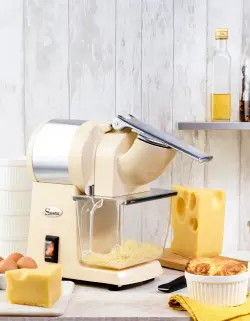 Ett brett utbud av rivskivor finns tillgängliga för att riva hård- och mjukost, choklad, jordnötter och torkad frukt.