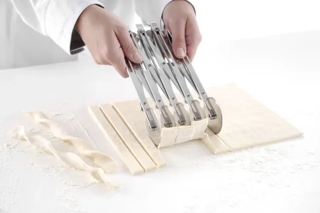 Cutting width can easily be adjusted from 56 to 515 mm. With 5 smooth Ø55 mm stainless steel cutting wheels.
