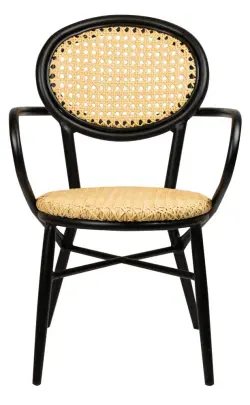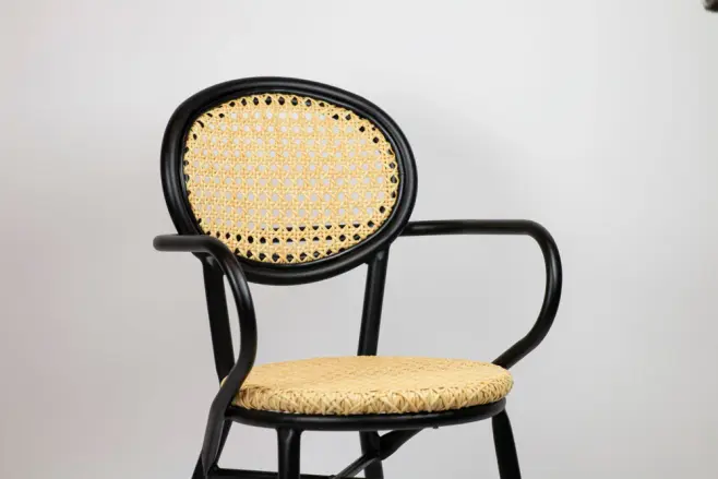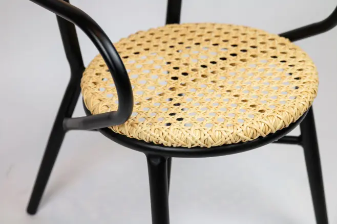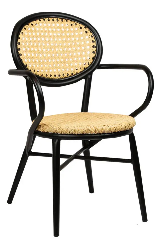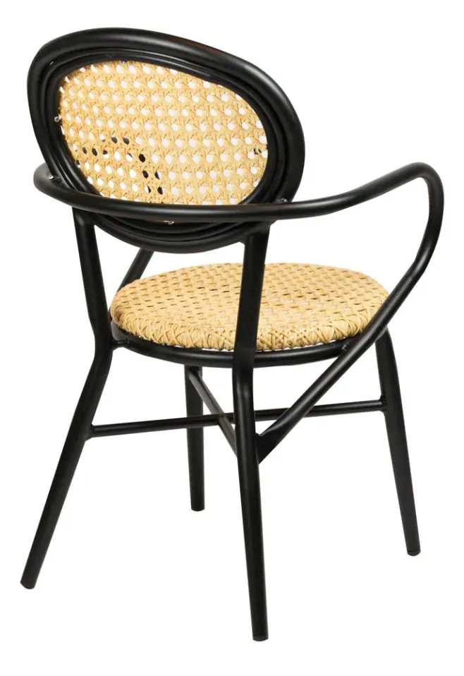 Elegant och klassisk stol i rotting till uteservering. Modell Aleca i svart och beige. Stolen kommer i en aluminiumram och kan enkelt staplas.