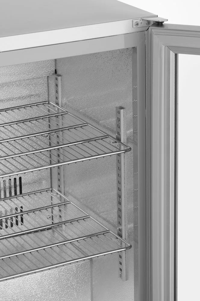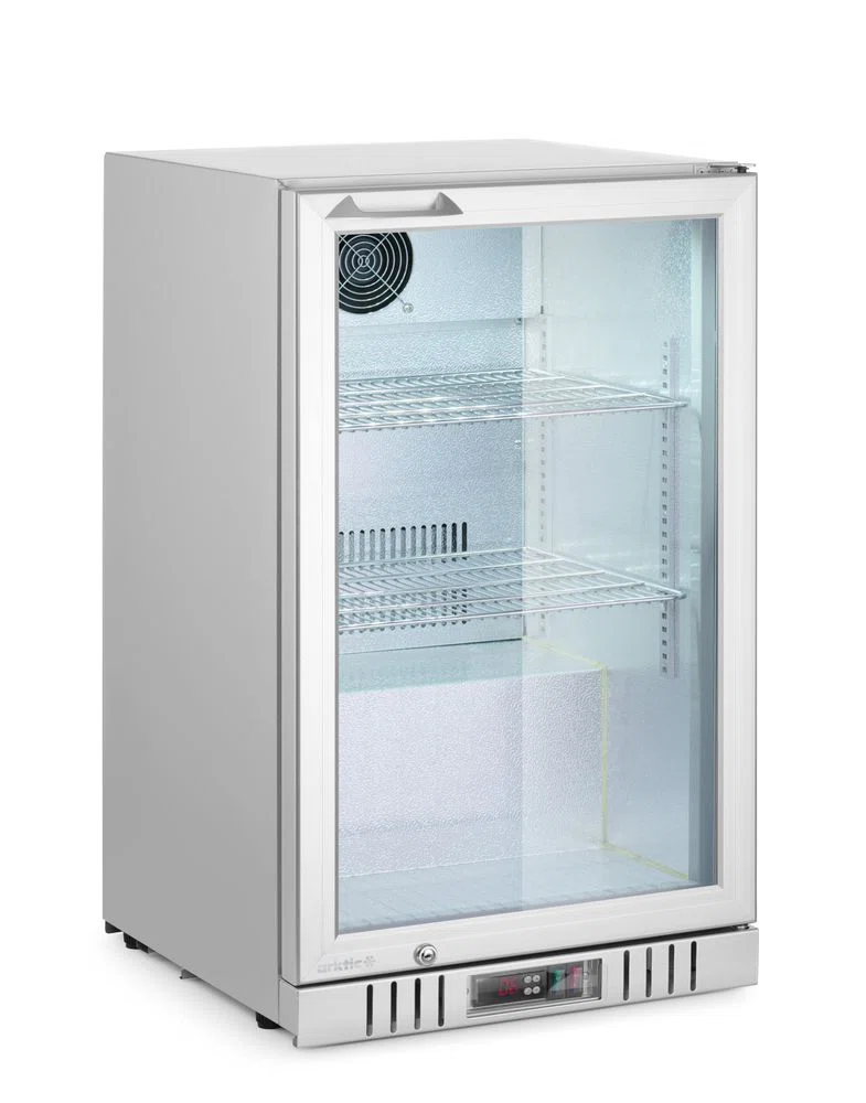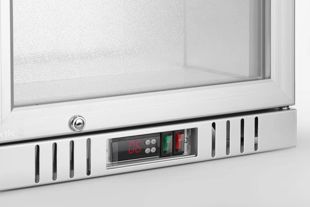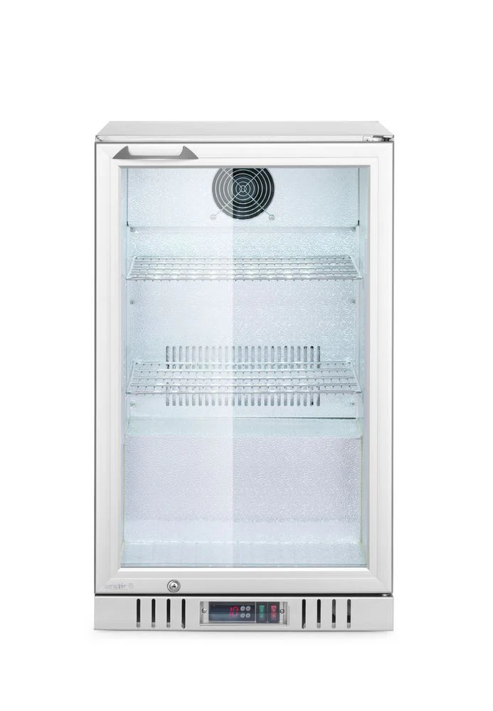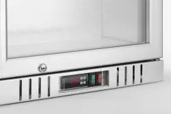 Backbar-kylskåp för effektiv och stilren kylförvaring av drycker och ingredienser. Tillverkat med hölje i förmålat stål och interiör i präglad aluminium. Utrustat med självstängande dörr med dubbelglas och härdat frontglas. Har ventilationskyla, automatisk avfrostning och temperaturintervall 0–10°C. Invändig LED-belysning och digital temperaturdisplay ger god överblick. Lås med nyckel och justerbara fötter ger säker och stabil användning.
