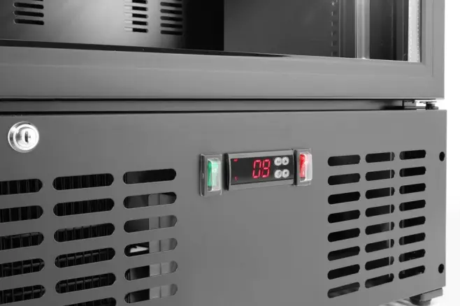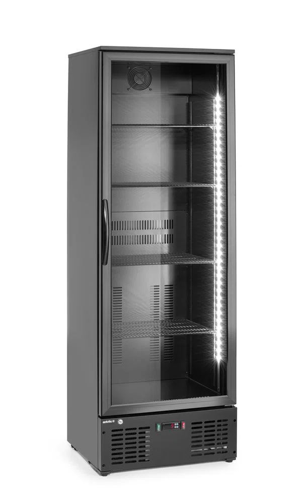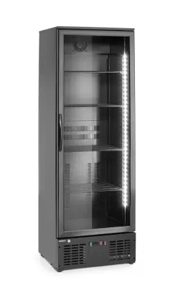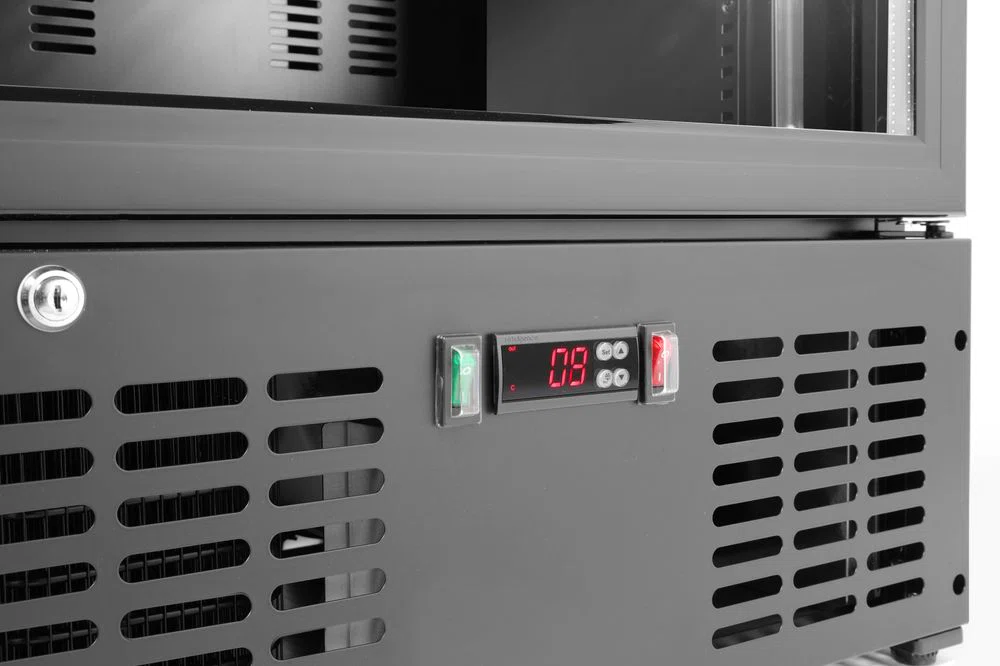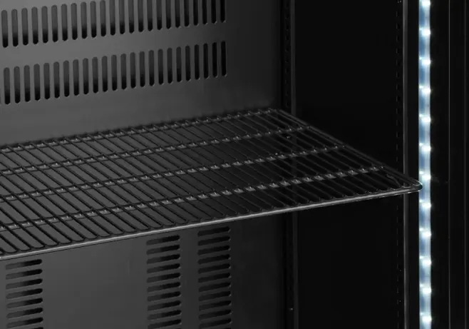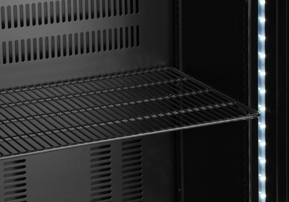 Professionella kylskåp för bar- och serveringsmiljöer. Tillverkat i svart pulverlackerat stål med glasdörr och LED-belysning för tydlig exponering av innehållet. Utrustat med ventilerad kylning, automatisk avfrostning och digital temperaturkontroll. Självstängande dörr med lås ger säker förvaring. Justerbara hyllor ger flexibel organisering och kylmediet R600a säkerställer energieffektiv drift.