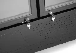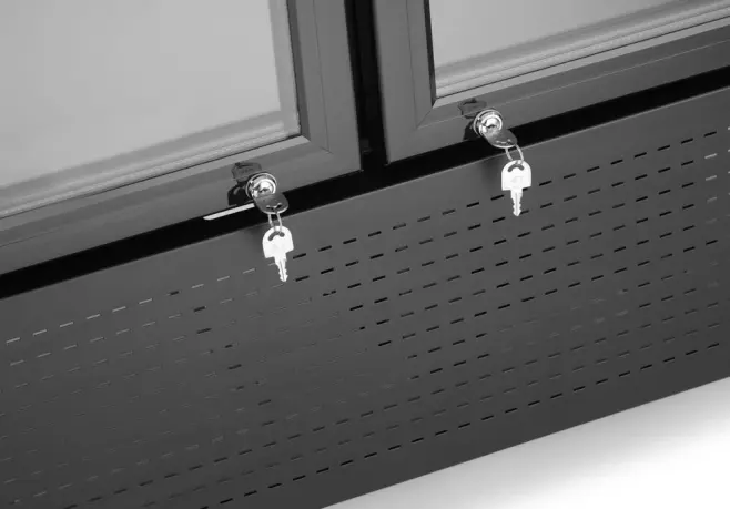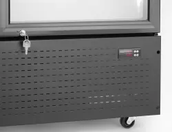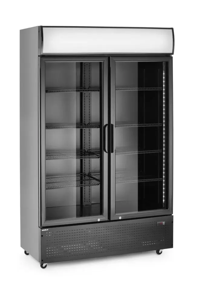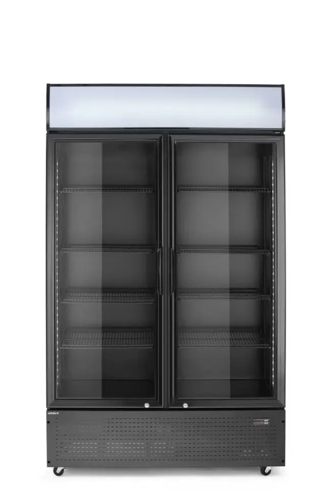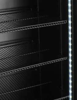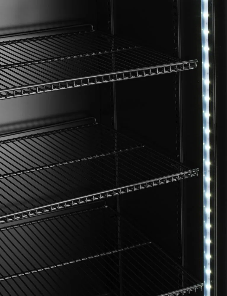Backbar-kylar med stor kapacitet och exponeringspanel för professionella miljöer. Svart pulverlackerat stål. Glasdörrar. Ventilerad kylning. Temperatur 0–10°C. LED-belysning. 8 hyllor. Bakbelyst panel.