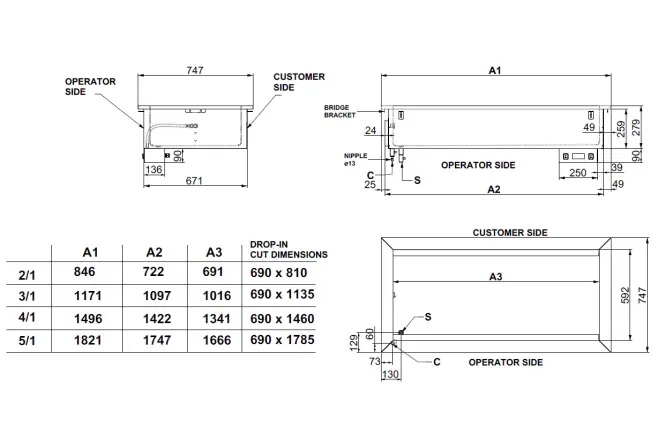 Alla DROP-IN-moduler finns i storlekar från 3 till 5 GN 1/1. Grundmoduler med statisk kylning (R) och bain marie (BM) finns också i storleken 2 GN 1/1.