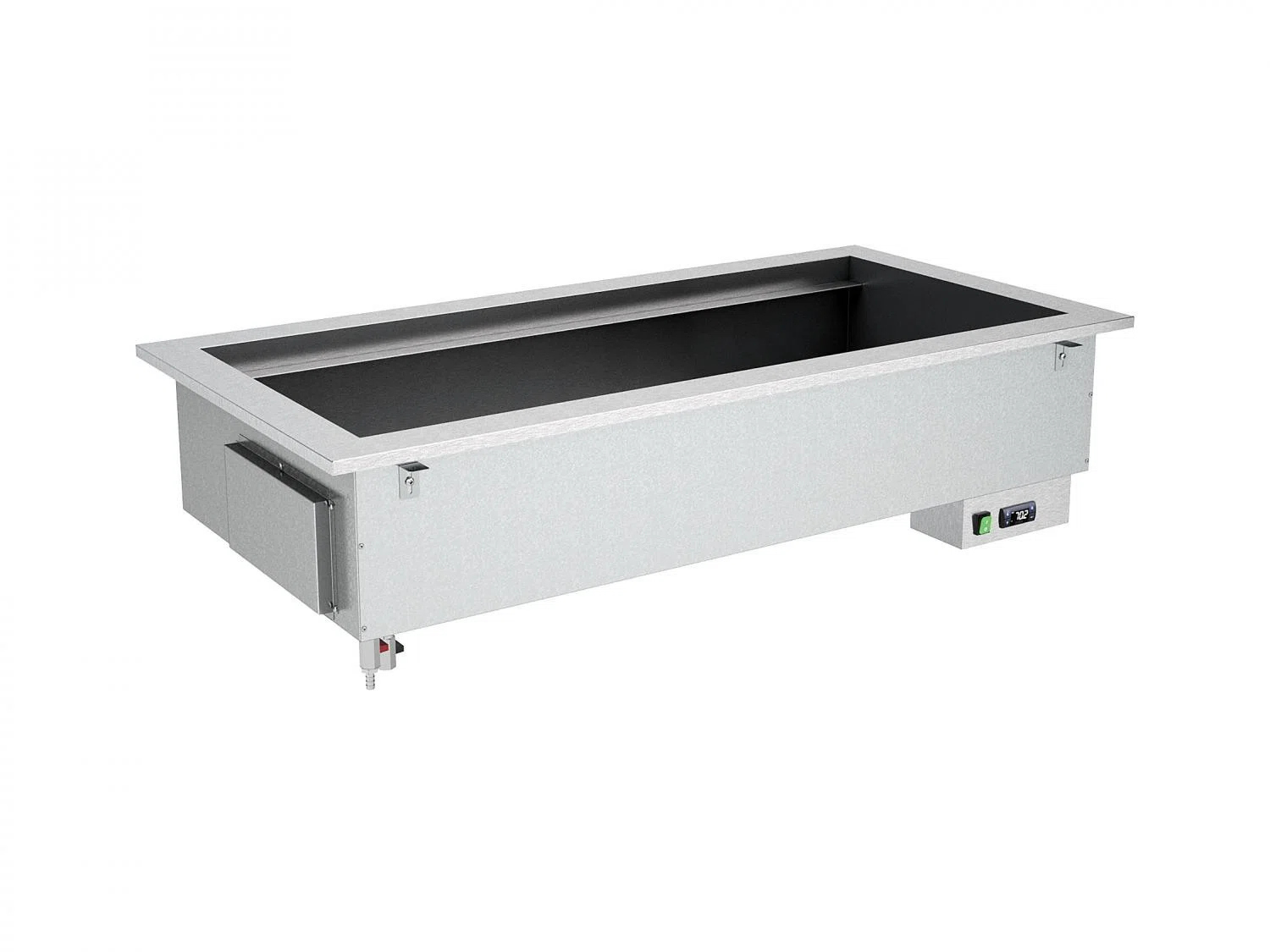 Bain-marie uppvärmd drop-in med en avloppshane och uppvärmning med silikonhäftande element. Brunnen temperaturreglerad med digital termostat. Kapacitet 4 GN 1/1.