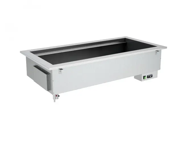 Bain-marie uppvärmd drop-in med en avloppshane och uppvärmning med silikonhäftande element. Brunnen temperaturreglerad med digital termostat. Kapacitet 5 GN 1/1.