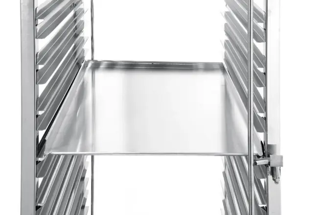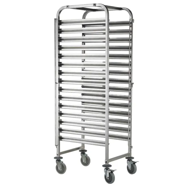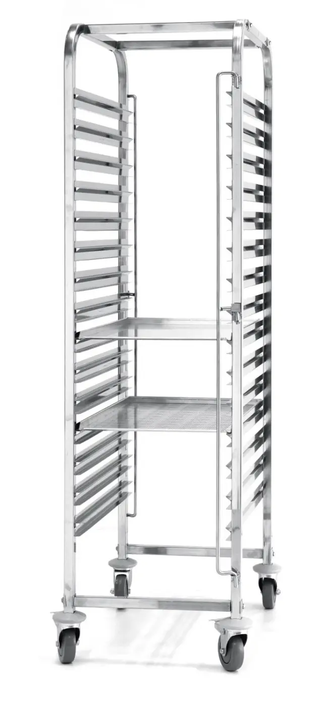 Gedigen bakplåtsvagn – bagerivagn till lågt pris. Kapacitet för 15 plåtar med 80 mm mellan varje gejder. För bageriplåtar i standardmått: 60 x 40 cm.