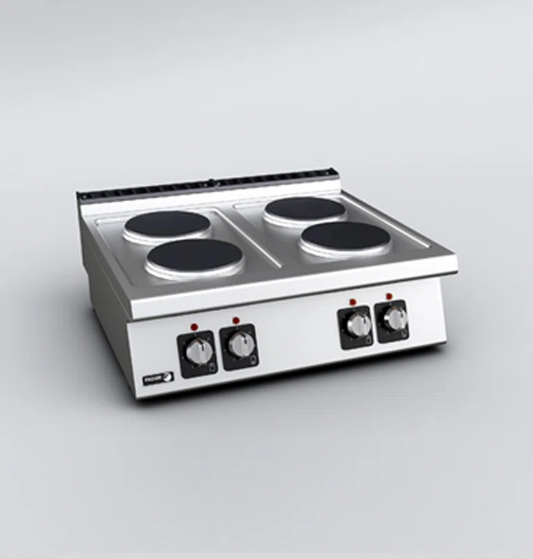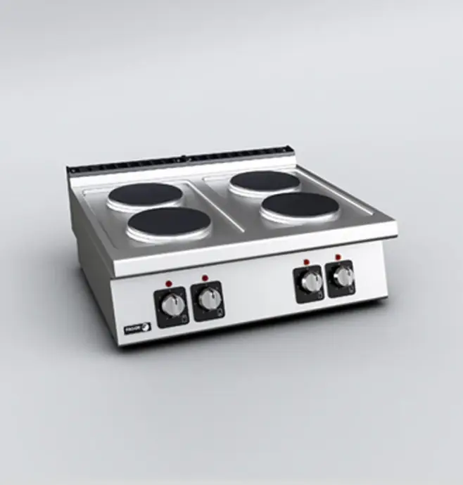 Elektrisk spis av Fagor Kore 700 anpassad för restaurang och storkök i bänkmodell med 4 värmeplattor i gjutjärn. En kraftfull spis som effektiviserar tillagningsprocessen i köket och ger perfekt stekyta på kött, fisk, grönsaker eller skaldjur.