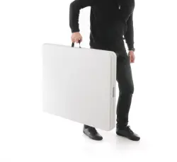 Easy to store and transport foldable furniture for outdoor and indoor use. Ideal for fairs, events, catering, rental, etc. Table top made of HDPE polyethylene, frame made of powder coated metal. Easy to clean and dirt-resistant.