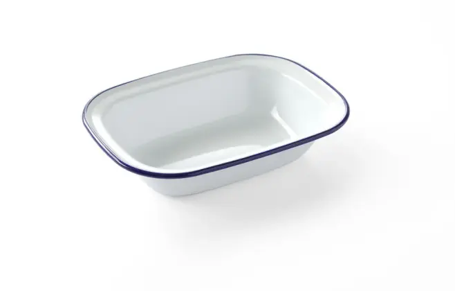 Emaljerad fyrkantig skål från Hendi, i vitt med blå kant. Mått på skålen är 215×160 mm. Emaljerad servis har gjort comeback. Vitlackerat stål med fin blå kant. Emalj av hög kvalitet. Nötningsbeständig. Skålen tål diskmaskin.