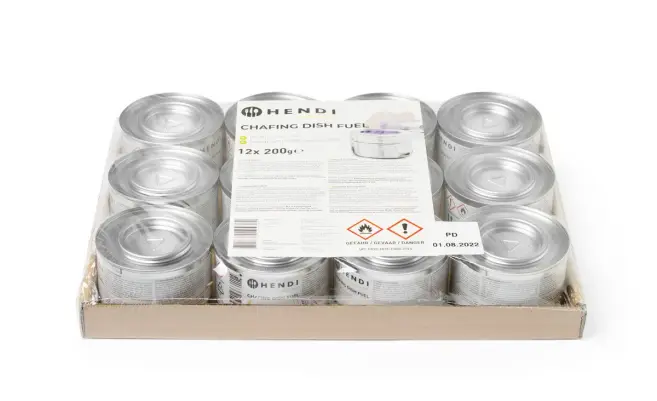 Burning gel är gjord av naturlig (bio) etanolalkohol, blandad med vatten och ett förtjockningsmedel för att göra den till en fast substans eller gel. Hendi brinnande gel är konstgjord för att smaka så bitter att det är omöjligt att svälja. För att på ett säkert och effektivt sätt värma upp t.ex. skavskålar, rekommenderar vi att brinnande gel används i speciella bränslehållare. Hendi erbjuder de vanligaste varianterna av brinnande gel. Uppvärmningskapaciteten är lika över hela området medan uppvärmningshastigheten är beroende av lågans storlek, bestäms av hur långt öppet locket på bränslehållaren hålls. ’Blaze’ varumärke har en kortare, mer intensiv bränning – det rekommenderas för applikationer där brinntiden kommer att vara cirka 2 timmar. ”Hendis brännande gel rekommenderas när över 3 timmars uppvärmning krävs. All Hendi och Blaze brinnande gel bränner sot- och luktfritt. Kartuscher och burkar utan speciella bränslehållare blir mycket varma vid användning, vilket skapar en betydande risk för brännskador om de inte placeras inuti en bränslehållare. Risk för brännskador! Dessa bränslehållare ingår både med Hendi skavskålar och finns separat. Läs alltid instruktionerna på produkten före användning. Se till att det inte finns några öppna lågor eller heta föremål i närheten när du arbetar med brinnande gel. Den brandfarliga ångan kommer lätt ut från behållaren. Se till att inget (kondens)vatten droppar in i det brinnande bränslet. Det kan orsaka farlig sputtering och stänk av bränsle. Tänd bränslet först efter att burkarna inuti bränslehållarna har placerats på den slutliga platsen. Lågorna är nästan helt blå, vilket gör dem mycket svåra att se i ljus. Försiktighet rekommenderas. Släck aldrig bränslet genom att stänga locket på bränslehållaren. Påfyllning: Se alltid till att burken och dess hållare har svalnat helt. Ta bort burken från hållaren för att fylla på burken. Förvaring: Förvara alltid i slutna behållare på en mörk, väl ventilerad plats, under 20°C. För förvaring av större mängder bränsle, vänligen konsultera lokala bestämmelser. Om instruktionerna ovan följs är risken för olyckor minimal. Vid start/liten brand: använd en brandfilt (eller en stor, våt filt) för att täcka elden och beröva den syre. Vid brand på kläder/kropp: använd en brandfilt eller en pulver/CO2 brandsläckare. Försök aldrig att släcka elden med en liten handduk eftersom det bara skulle sprida bränslet och lågorna! Efter att ha släckt elden håll kroppen kall i 15 minuter eller tills medicinsk hjälp anländer. Lämna kläderna på plats. Sök alltid medicinsk hjälp omedelbart.