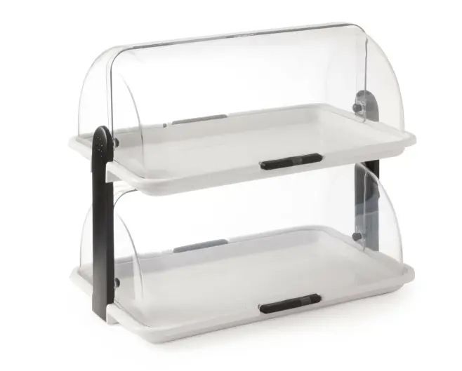 Dubbel bricka och kupol med roll top. Perfekt för frontning av mackor, bakverk och uppskuren frukt. 465x310xH190mm
