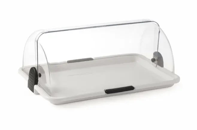 Bricka och kupol med roll top. Perfekt för frontning av mackor, bakverk och uppskuren frukt. 465x310xH190mm