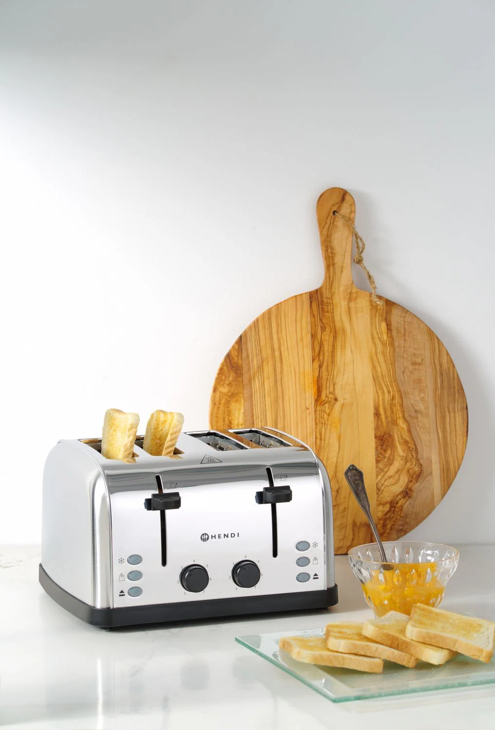 HENDI Toaster 4-skivor tillagar upp till 4 välrostade eller lätt gyllene brödskivor tack vare sina 7 brynningsnivåer och 3 funktioner: rostning, återuppvärmning och avfrostning. Brödrosten har 2 löstagbara smulbrickor och 2 värmezoner som styrs oberoende av varandra med ett vred. Brödrosten har 4 rymliga brödfack som rymmer en mängd olika bröd och tjocklekar på brödskivorna.