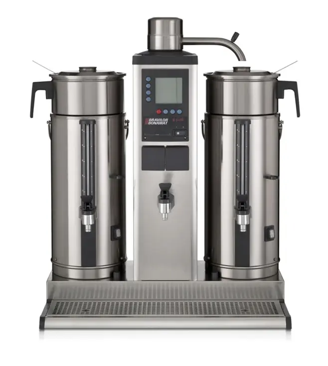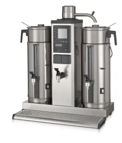 Bryggare för korgfilter med separat hetvattenkran och för utrymmen med vattenanslutning. Brygger stora mängder kaffe i separata behållare. Utrustad med digital display, total- och dagräknare, avkalkningssystem, signal när kaffet är klart, inbyggd timer och hög säkerhet. Levereras med behållare av VHG-typ, bryggenhet(er) och spillbricka.