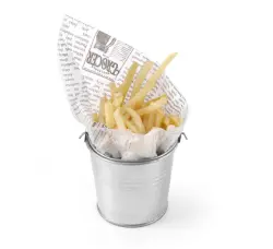 Tillverkad av galvaniserad stålplåt skapar detta ett rustikt utseende. Galvaniserat stål är inte avsett för matkontakt, fodra hinkarna med våra smörpappersark när du använder det för servering av mat.
