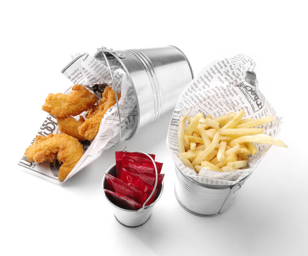Made of galvanized sheet steel, this creates a rustic look. Galvanized steel isn’t intended for food contact, line the buckets with our greaseproof paper sheets when using it for serving food.