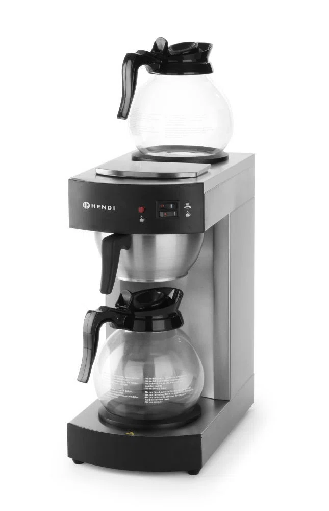 Top and bottom hotplate, indicator light. Fast filtering system with flow-through element – 1.8 litres in 5 minutes. Continuous temperature of 93 – 96°C. Casing and filter holder made of stainless steel. 2 x 1.8 l decanters and 25 (90/250) filters are included.