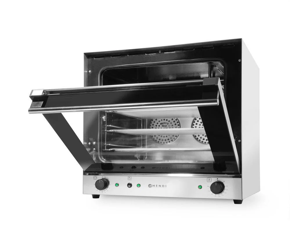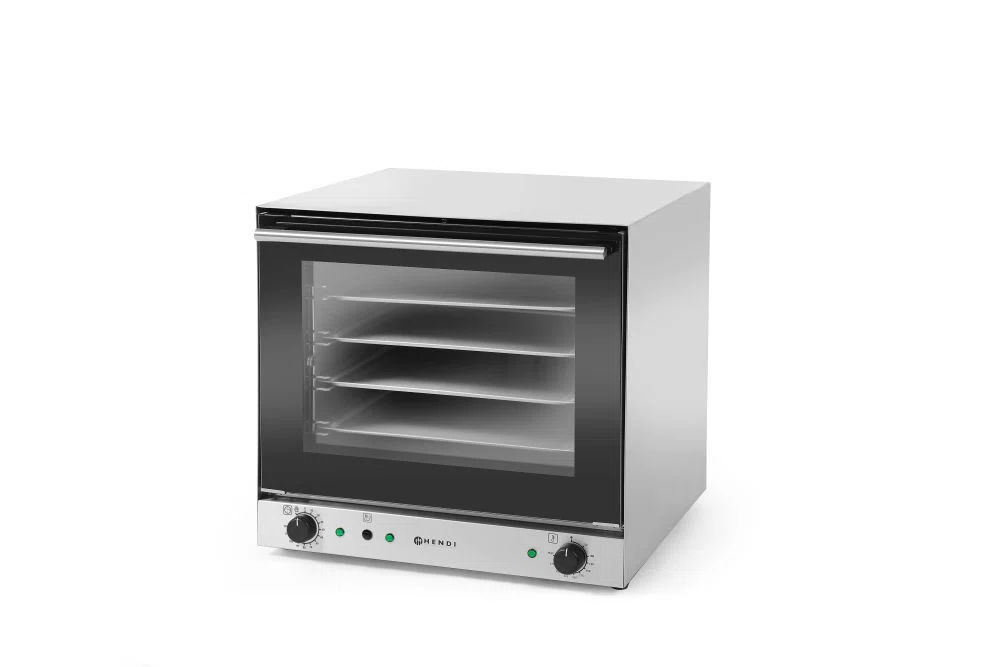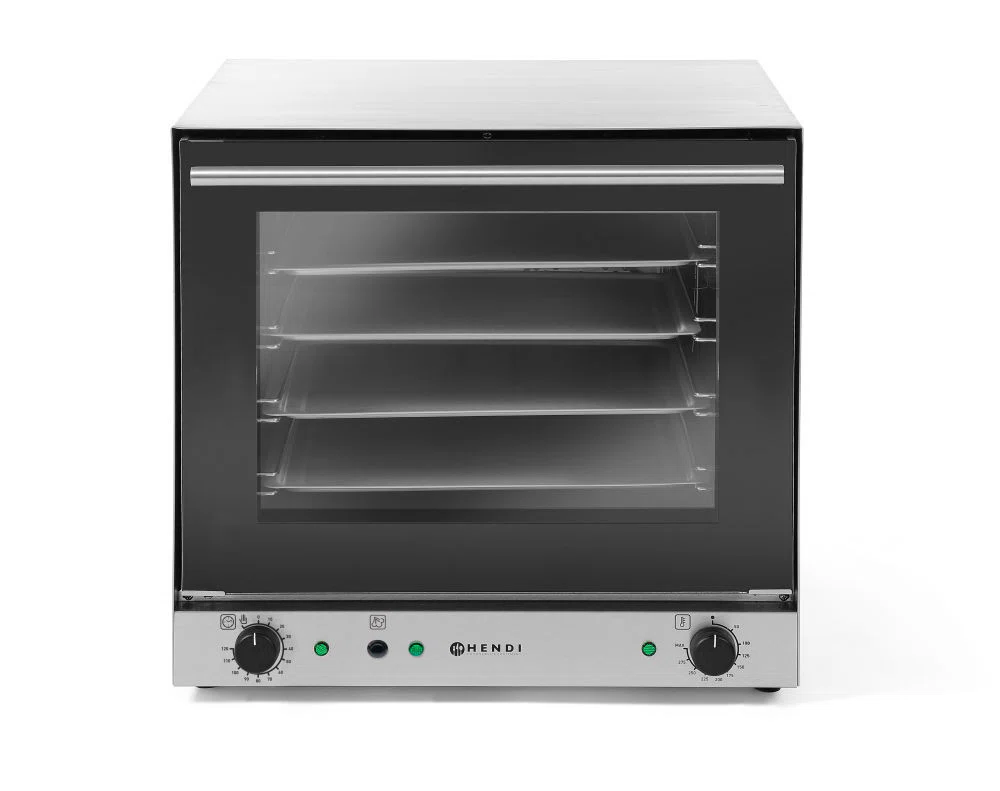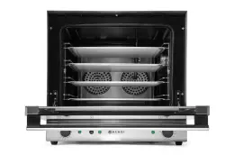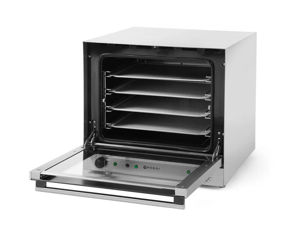 Stainless steel body, door with double glazing. Cool touch door which can be removed to ease cleaning. Inside is partially enamelled and has interior lighting. Heating by means of two heating elements and two fans. Temperature adjustable from 50°C to 300˚C. Direct humidification, manually operated with a button and adjustable by a micro-valve at the inlet. Waterinlet, which can be connected to water supply, and drain at the back. Timer adjustable from 0 to 120 minutes. Oven fits 4 trays, distance between the trays is 70 mm. Supplied with 4 trays (438×315 mm).