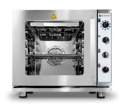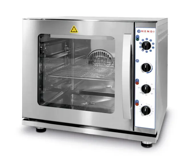 High-quality stainless-steel body and chamber. Manual control panel with knobs for function, temperature, time and amount of steam. Has functions for defrost, pre-heat, convection, grill, steam or a combination of those functions. Temperature can be set up to 280˚C Timer can be set up to 120 minutes. Convection by means of two heating elements and one fan With top grill elements. Oven fits 4 GN2/3 trays, distance between the trays is 70 mm. Supplied with 1 grid GN2/3. Convection 3 kW, grill: 1.8 kW. Chamber heaters: bottom 1.6 kW, top 0.7 kW. Adjustable feet from 55 to 75 mm.