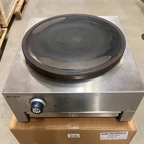 Utformad för att göra crêpes. Bakplåt Ø400 mm tillverkad av gjutjärn med keramisk beläggning. Mycket jämn värmefördelning över hela ytan. Inklusive spridare i trä. Hölje av rostfritt stål. Termostat steglöst inställbar från 50 till 250°C. Med överhettningsskydd och EGO-termostat.