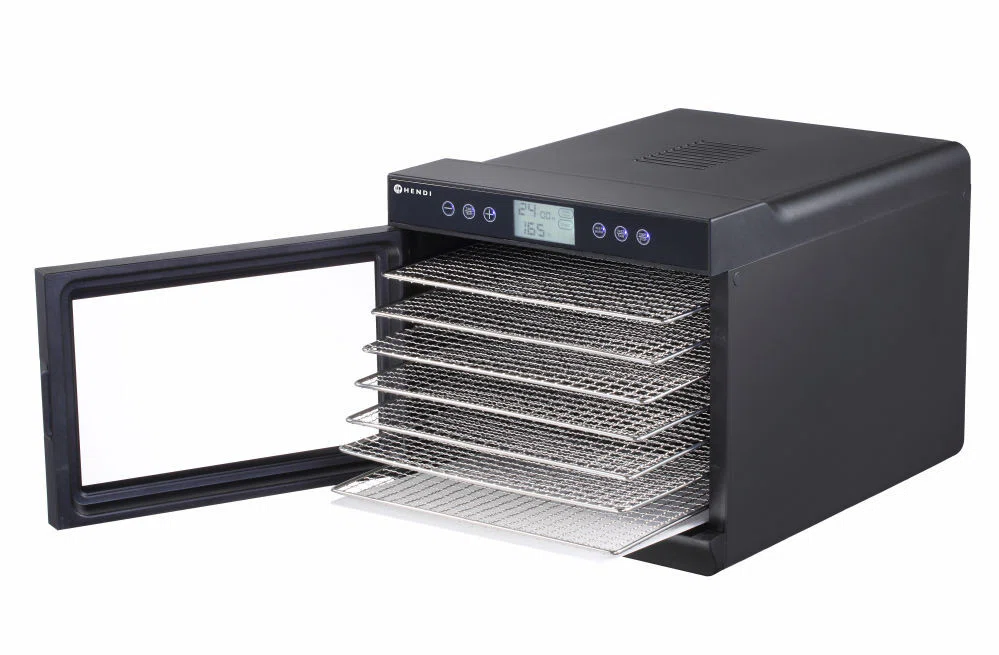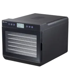 Torkugn för torkning av frukt, grönsaker, örter, kött, fisk etc. Automatiska fläktar cirkulerar den varma luften för ett jämnt torkat resultat. Utrustad med 7 rostfria 375×300 mm brickor som rymmer upp till 500 g vardera. Brickorna är jämnt fördelade och lätta att ta bort och rengöra. Höljet och dörren är tillverkade av polypropylen och har dubbla väggar, vilket ger bättre temperaturprestanda. Tack vare den transparenta dörren kan du hålla ett öga på torkningsprocessen. Levereras med en transparent kudde som kan användas för att fånga upp rester på torkens botten eller för att göra fruktläder. Digital display, justerbar temperatur från 35° till 70°C. Timer kan ställas in från 30 min upp till 24 timmar i 30-minutersintervall.