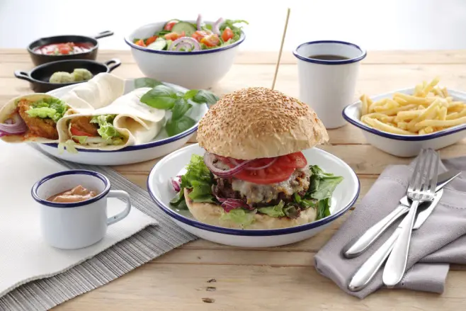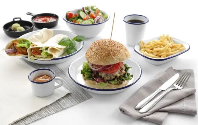 Emaljerad servis har gjort comeback. Vitlackerat stål med fin blå kant. Emalj av hög kvalitet. Nötningsbeständig.