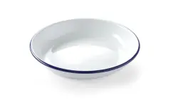 Emaljerad servis har gjort comeback. Vitlackerat stål med fin blå kant. Emalj av hög kvalitet. Nötningsbeständig.