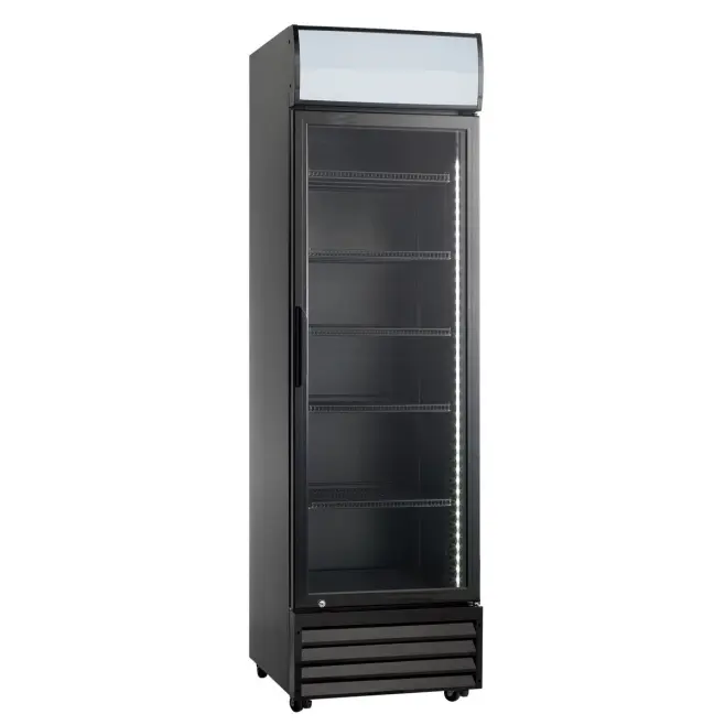 KP414B är en snygg displaykyl i svart med en dörr och 280 nettoliter kylutrymme.