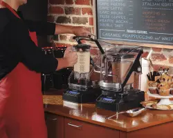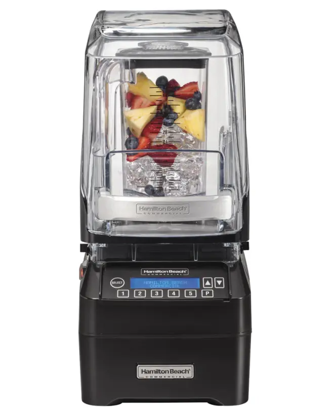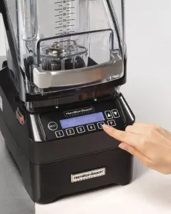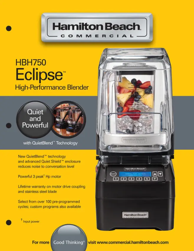 Blender med kraftfull 3 HP motor och Wave-Action behållare. Standard: Enheten levereras med bas, en behållare på 48 oz./1,4 L, Quiet Shield™ ljudkåpa. Hamilton Beach är världsledande kvalitetsmärke inom blenders och mixers för profesionella. QuietBlend™-tekniken minskar ljudnivåerna dramatiskt Kraftfull 3 peak Hp* motor 48oz / 1,4L Wave~Action®-behållare jämfört med HBH755 Finns i både 120V och 230V