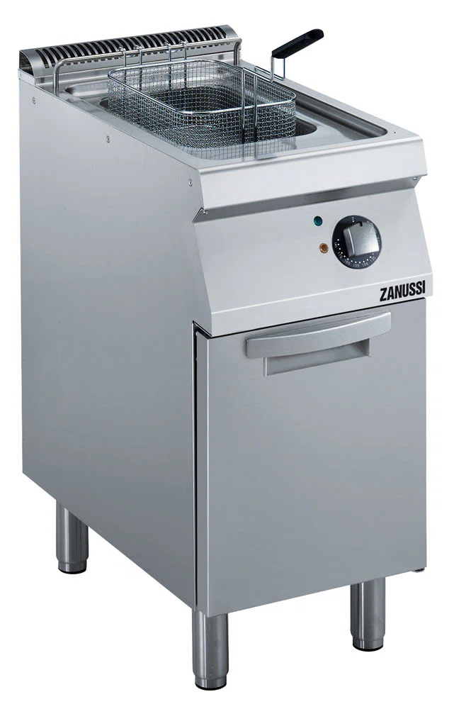Fritös. El. Golvmodell. 400mm. 15L. V-formade bassänger. Dolda element. Underskåp.