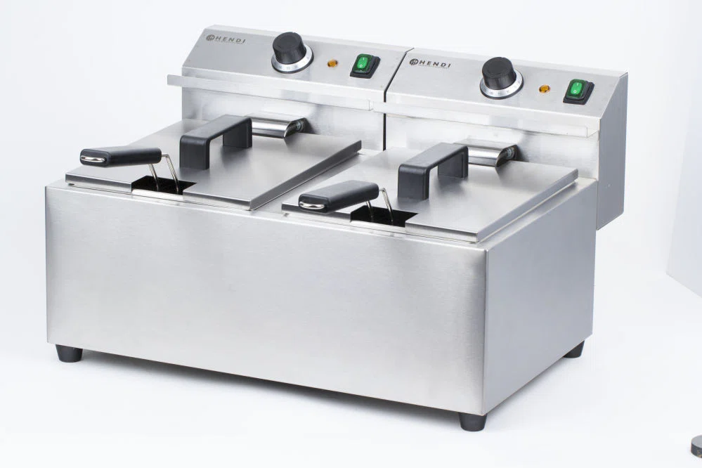 The Mastercook range of tabletop deep fryers is made of 18/0 stainless steel. Element with switch-off function when removed. Oil tank with a V-shaped bottom ensures an optimal cold zone, increases the useful life of the oil. The clear controls with temperature pilot lights can be found on top of the equipment. Protected against overheating by means of a re-settable thermal fuse. A frying basket with extra long handle turns this model into a fine piece of equipment for intensive use. All deep fryers come with frying basket(s) and lid(s).