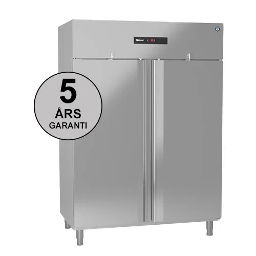 Utrustad med en högerhängd och en vänstehängd dörr med dörrlås, självstängande dörrar, 8 grå trådhyllor, LED ljus.