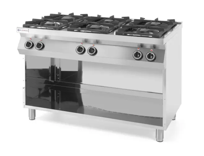 Burners: 3x 3.5kW + 3x 6kW Suitable for natural gas, extra LPG nozzles included Pans: Ø120-300mm Cast iron pan support 335x300mm, one for each burner Cabinet closed on 3 sides, internal dimensions: 1198x570x(H)470 mm Thermocouple Cooker worktop: AISI 304 Housing: AISI 430 Steel adjustable feet: 100-165mm Weight: 95kg