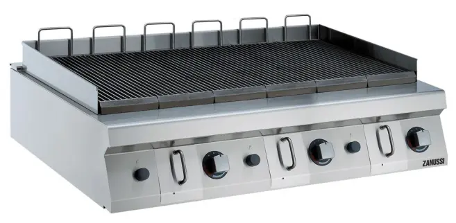 Brännarna skyddas av en deflektor i rostfritt stål AISI441 som når ca 700 °C. Strålande plattor på ovansidan och på sidorna fördelar värmekraften jämnt samtidigt som de skyddar deflektorn från direktkontakt med det droppande fettet, vilket minskar uppblossningen.