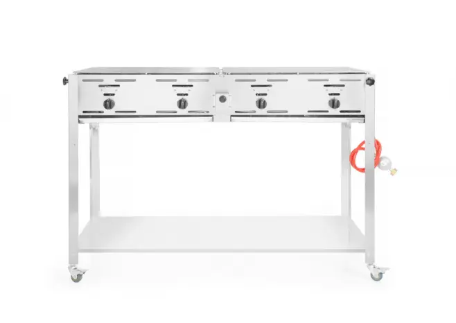 Ram helt i rostfritt stål med dubbla droppbrickor. Lämplig för propan och butangas och utrustad med 4 brännare som kan regleras oberoende av varandra. Levereras med 2 nickelplätterade galler samt en emaljerad bak/stekplåt (590×480 mm). Termoelement och elektrisk tändning. Gasslang and tryckregulator ingår. Förbrukning 0,8 m³/h. Ansluten på bas med bottenhylla och 4 hjul för enkel rörlighet.