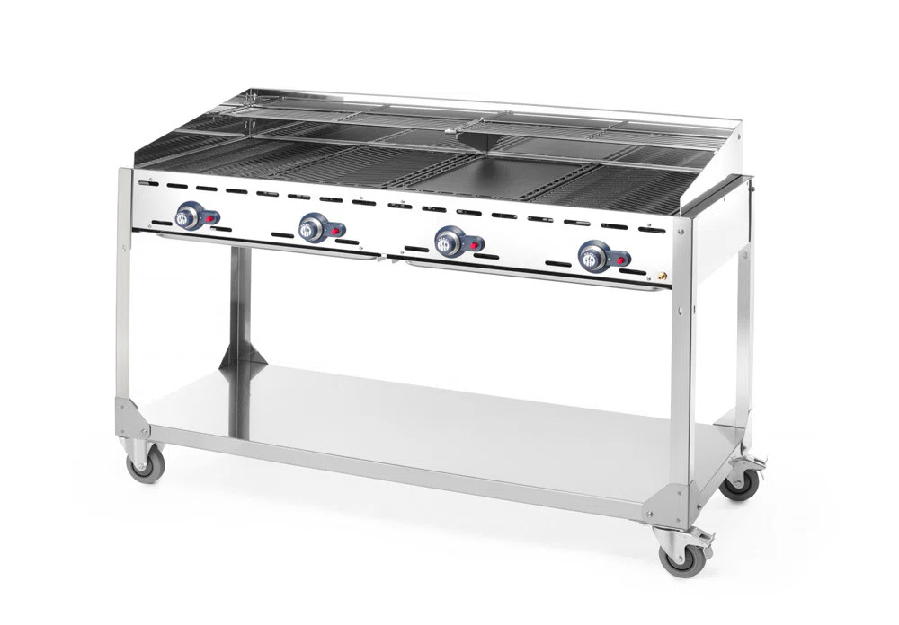 Gasgrill med 4 brännare för utomhusbruk. Tål vind bra p.g.a lufttillförseln och ren grillning med lågt CO-utsläpp. Lätt att rengöra tack vare avtagbara brännare och GN 2/2 droppbricka. 2 st emaljerade gjutjärnspannor och 2 st GN 1/1 nät ingår. Levereras med vindskärm. Gasslang med anslutning till grillen. Gasslang och regulator kopplas till gasflaska. Beställ med eller utan hjul.