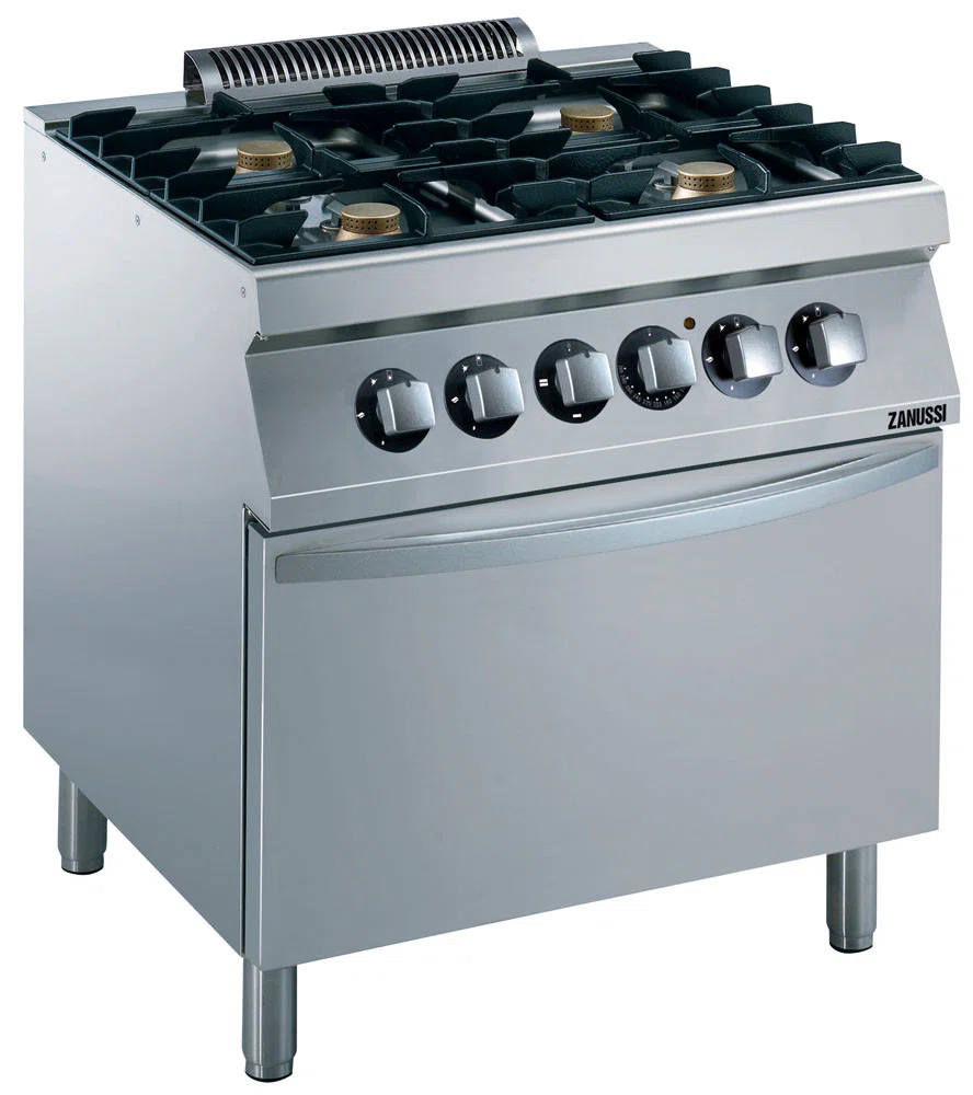 Gasspis (800mm) i golvmodell med 4 öppna brännare (4×5,5kW), för användning med naturgas, gasol eller stadsgas. Anpassad för anslutning underifrån eller bakifrån, och för montering mot enheter i Zanussi 700-serie. Utrustad med elugn (6kW) placerad under spis.