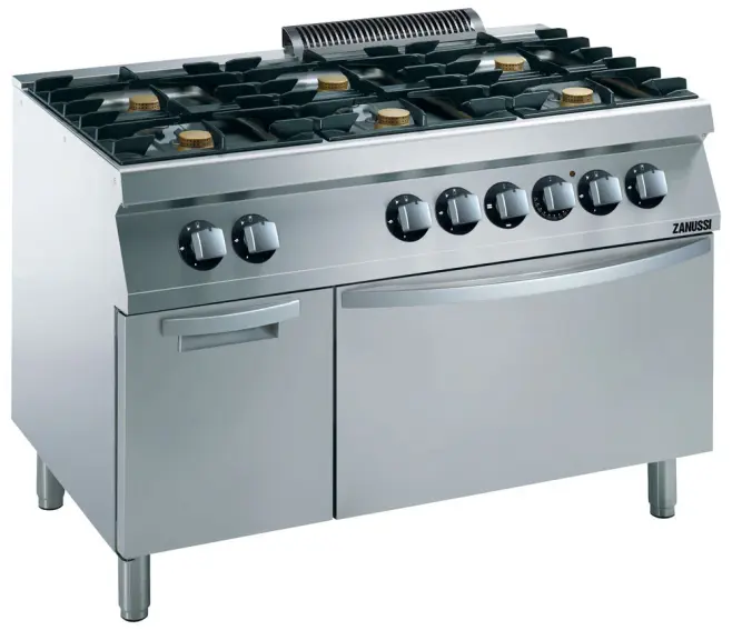 Gasspis (1200mm) i golvmodell med 6 öppna brännare (6×5,5kW), för användning med naturgas, gasol eller stadsgas. Anpassad för anslutning underifrån eller bakifrån, och för montering mot enheter i Zanussi 700-serie. Utrustad med elugn (6kW) placerad under spis.