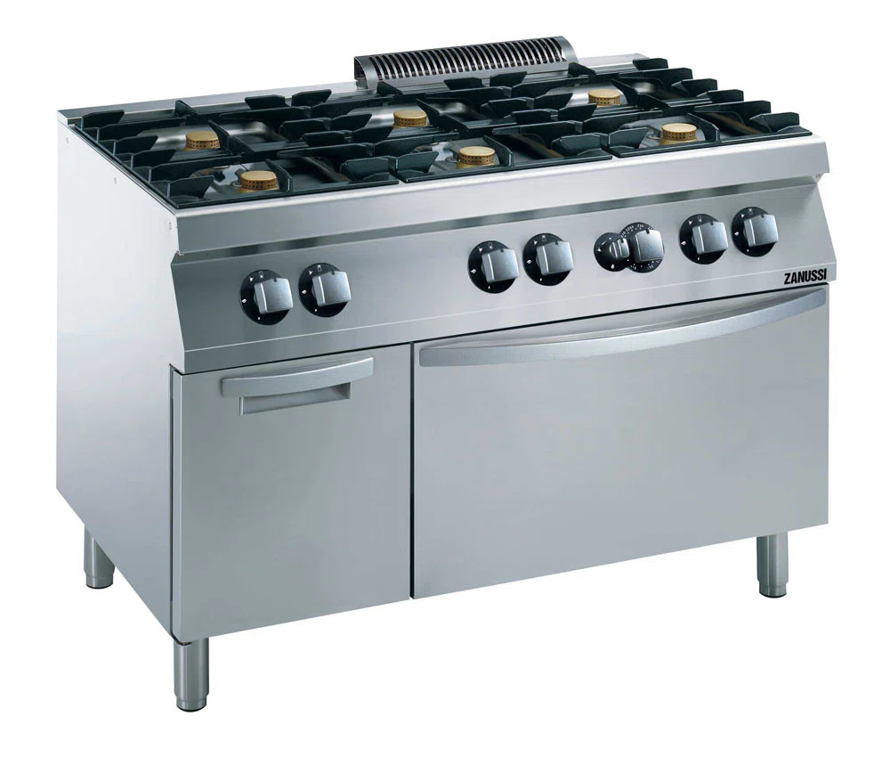 Gasspis (1200mm) i golvmodell med 6 öppna brännare (6×5,5kW), för användning med naturgas, gasol eller stadsgas. Anpassad för anslutning underifrån eller bakifrån, och för montering mot enheter i Zanussi 700-serie. Utrustad med gasugn (6kW) placerad under spis.