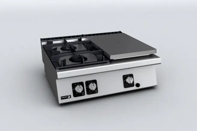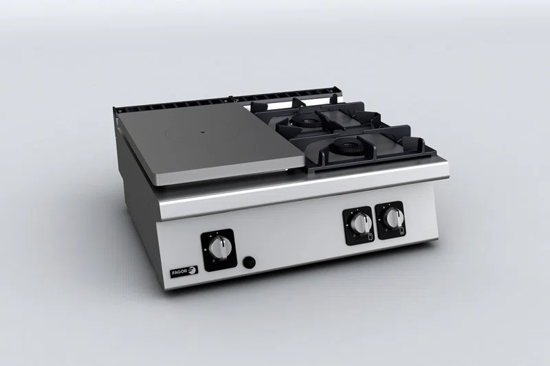 Kraftfull gasspis med 2 brännare kombinerad med solid platta för restaurang och storkök. Den perfekta kombinationen om man gillar att exprementera med matlagningen. En gasspis som bidrar till en effektiv matlagning och ger en perfekta stekytan som du eftersträvar.