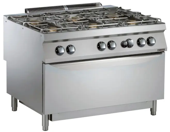 Gasspis. Golvmodell. 1200mm. 6 öppna brännare (4x6kW + 2x10kW). Stor gasugn (12kW), gasoldysor bifogas. Stadgasdysor (206385) beställs separat.