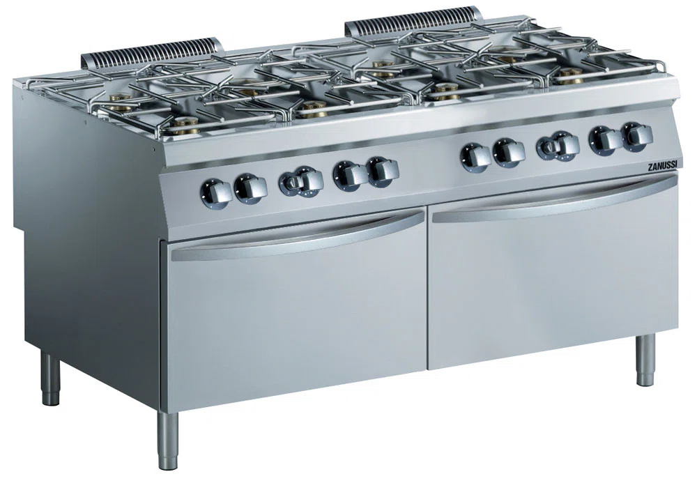 Gasspis . Golvmodell. 1600mm. 8 öppna brännare (6x6kW + 2x10kW), gasoldysor bifogas. På 2 gasugn (à 8,5kW) med 3 nivåer för 2/1 GN kantiner. Flower Flame brännare anpassar sig efter kokkärlets storlek för effektivare uppvärmning och ökad energisparning. Stabila kastrullstöd i rostfritt stål. Flamskyddssäkring som standard på brännarna skyddar mot oavsiktlig släckning av lågan. Extra tjock topplåt 2 mm. Stadgasdysor beställs separat.