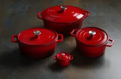 Tillverkad av gjutjärn, med röd emaljbeläggning på utsidan. Lock med stötar på insidan som tvingar vattendroppar (ånga) att falla tillbaka, vilket håller skålen fuktig och aromatisk. Lämplig för alla värmekällor inklusive induktion. Tål inte diskmaskin. Finns i olika storlekar; den minsta kan användas som serveringsfat (kod: 626856).
