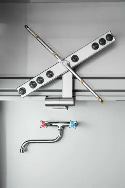 Maskinen har två roterande diskarmar och sköljarmar som säkerställer optimal och korrekt spridning av vattnet vilket ger ett perfekt diskresultat.