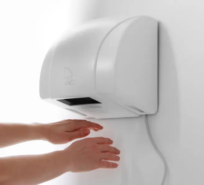 Elektrisk handtork med rörelsedetektor. Hölje i slagkraftig metall. Mått: 1500W 268x240x208 mm. V: 230, W: 1500.