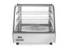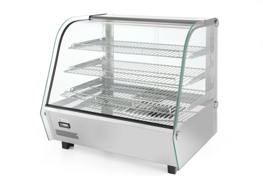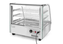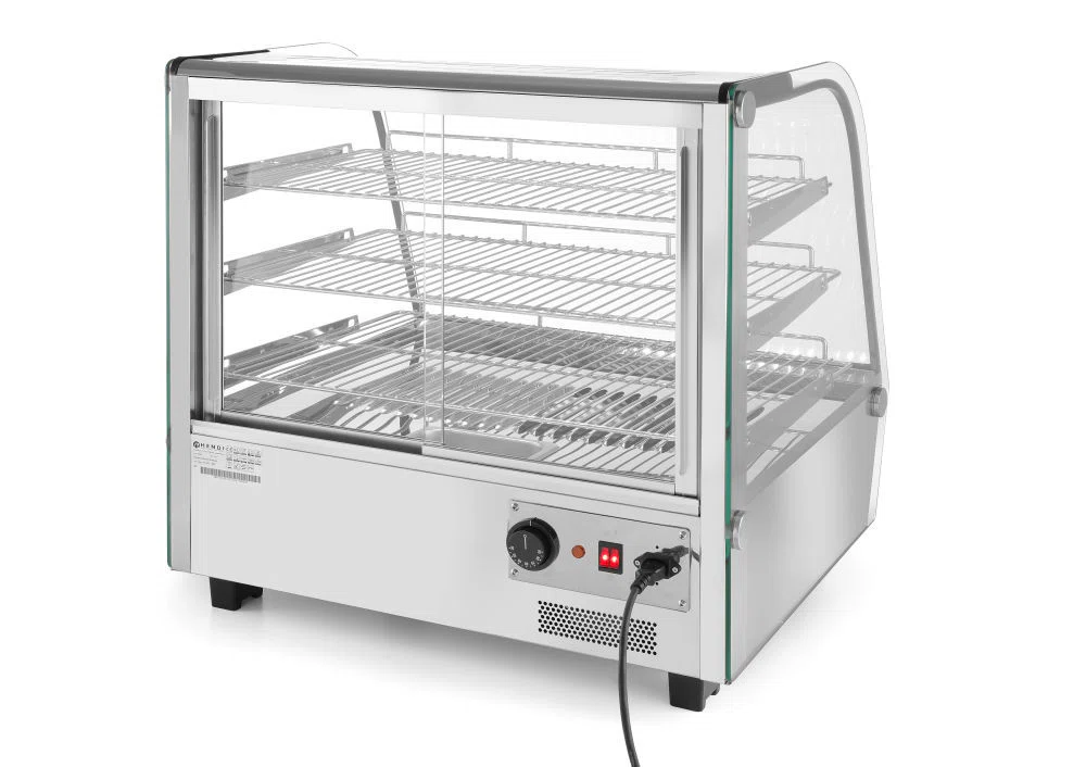 Fitted with double glazing and curved front glass. Access via two sliding doors at the back. Stainless steel housing. Fitted with LED lighting at the top. With 3 chrome plated shelves, adjustable in height. Temperature controller and display. Temperature range: 30 up to 90°C