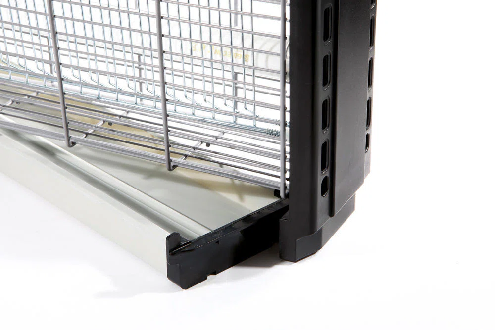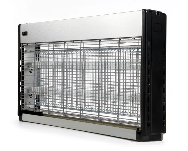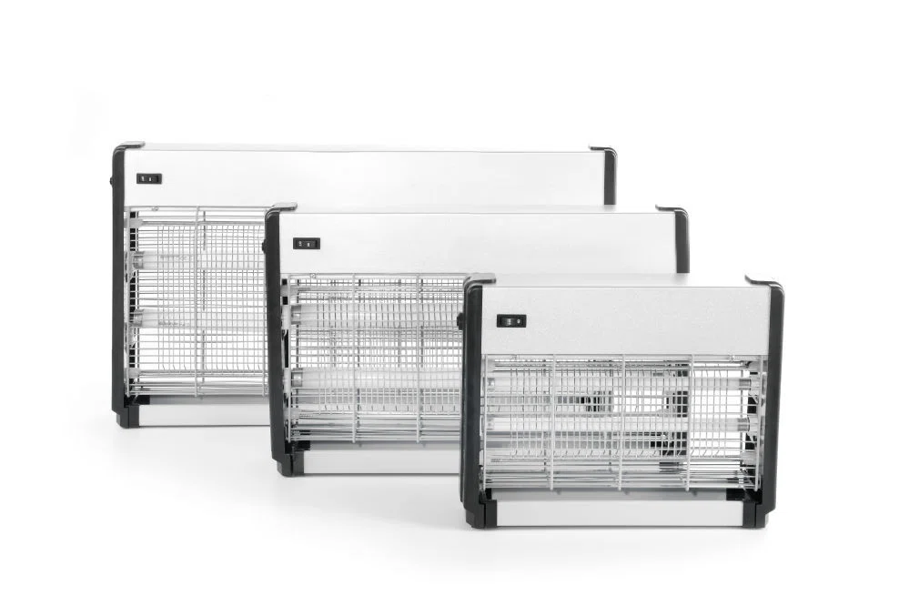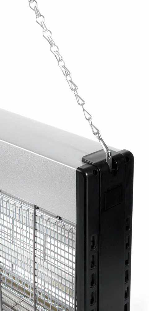 For indoor use. Body made of special treated aluminum alloy and ABS, fire resistant materials for high safety. 2x UV-A tubes. Insects are electrocuted with 2000 – 2500 V Removable collection tray, easy to clean. Can be mounted to ceiling by chain or used free standing.