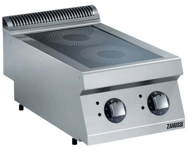 Induktionsspis (400mm) i bänkmodell, med 2 oberoende värmezoner (2x3,5kW) i 230mm diameter designad för snabb uppkokning och minimerad energiförlust. Anpassad för anslutning underifrån eller bakifrån, och för montering mot enheter i Zanussi 700-serie.