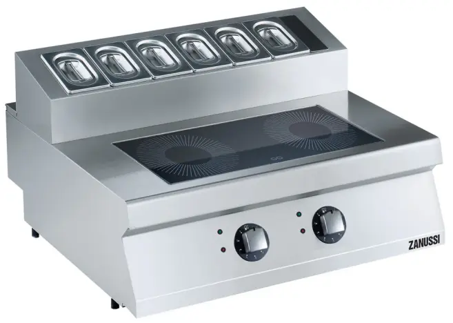 Induktionsspis. Bänkmodell. 800mm. 2 värmezoner (2×3,5kW) sida vid sida med kantinränna (för 6×1/9GN).