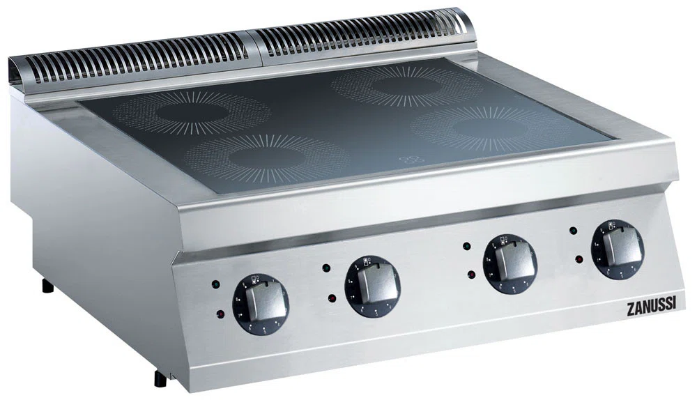 Induktionsspis (800mm) i bänkmodell, med 4 oberoende värmezoner (4x3,5kW) i 230mm diameter designad för snabb uppkokning och minimerad energiförlust. Anpassad för anslutning underifrån eller bakifrån, och för montering mot enheter i Zanussi 700-serie.